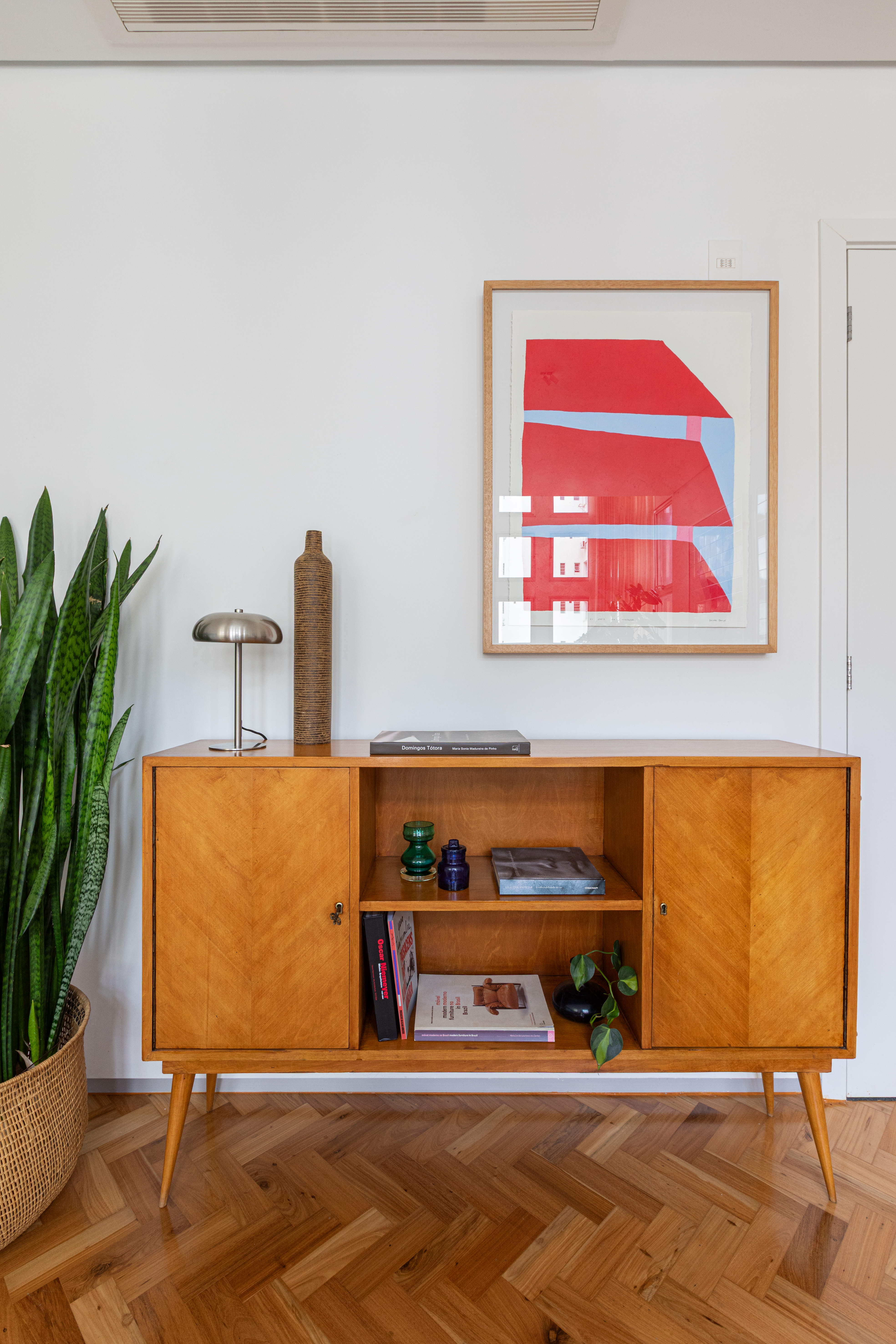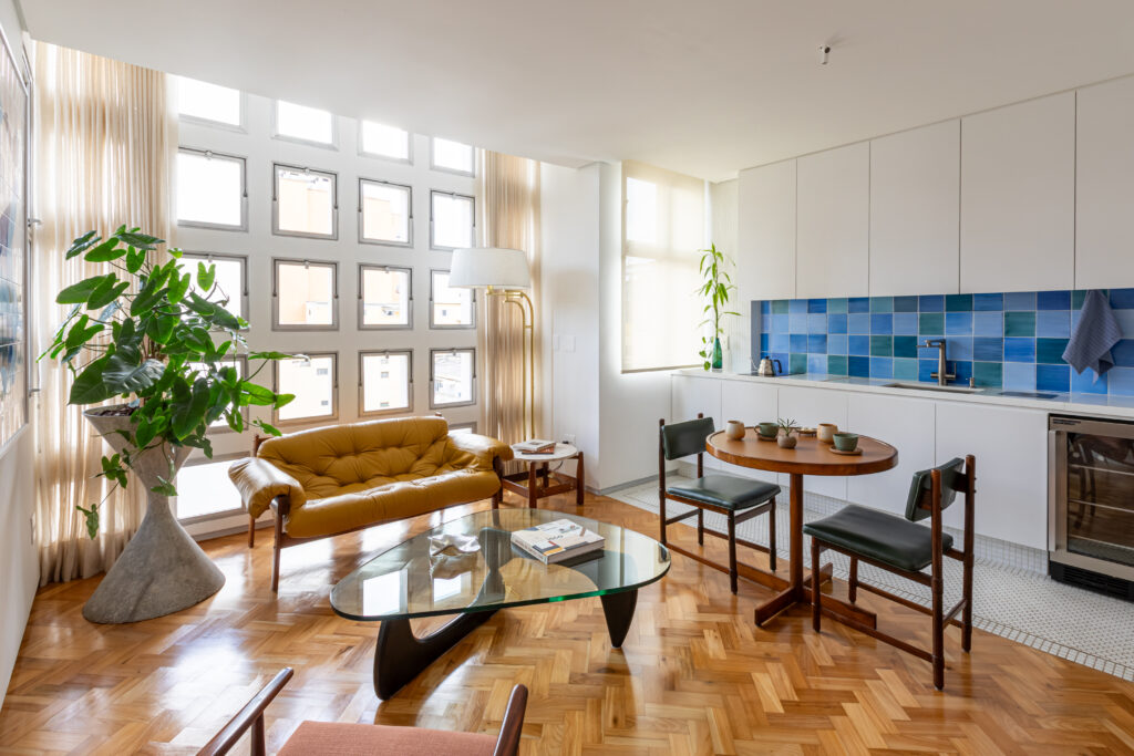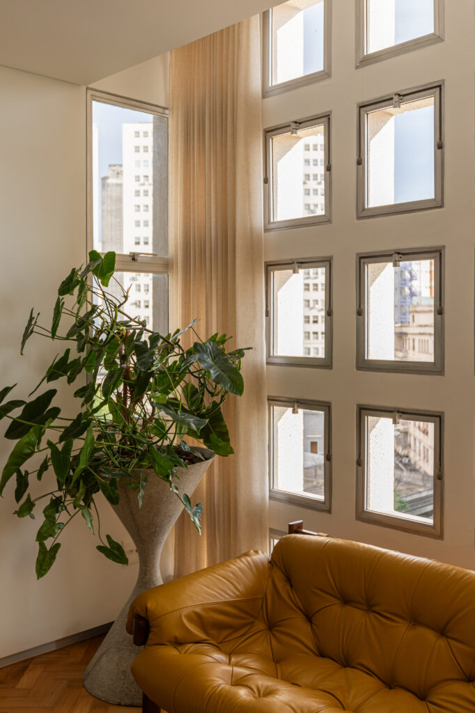 Buscando resgatar a memória construtiva original do prédio, a proposta incorporou elementos como tacos de peroba-do-campo e pastilhas cerâmicas. Esses materiais se unem a uma curadoria criteriosa de mobiliário assinado por nomes fundamentais do design modernista, como Jorge Zalszupin, Percival Lafer, Giuseppe Scapinelli, Celina Zilberberg, Luciano Santiago, Dominici, Cimo, Willy Guhl e Isamu Noguchi, reforçando a identidade estética do projeto e ativando vínculos afetivos e culturais com o modernismo nacional e internacional.