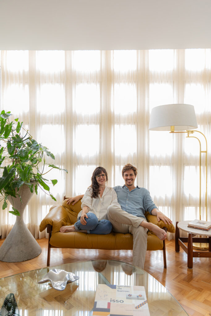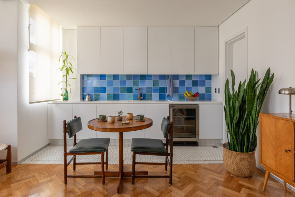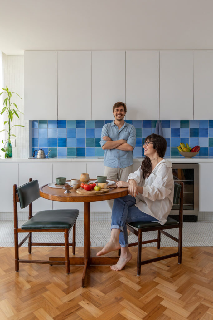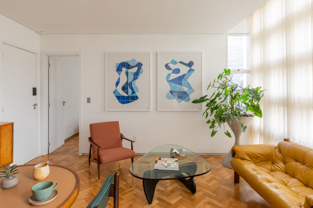 As cores e formas que definem a atmosfera do apartamento ganham ainda mais força com os trabalhos em azulejaria do artista mineiro Alexandre Mancini, presentes no painel da cozinha e no díptico que compõe a sala. Essas obras estabelecem conexões visuais entre os diferentes ambientes e contribuem para a narrativa sensível do espaço.