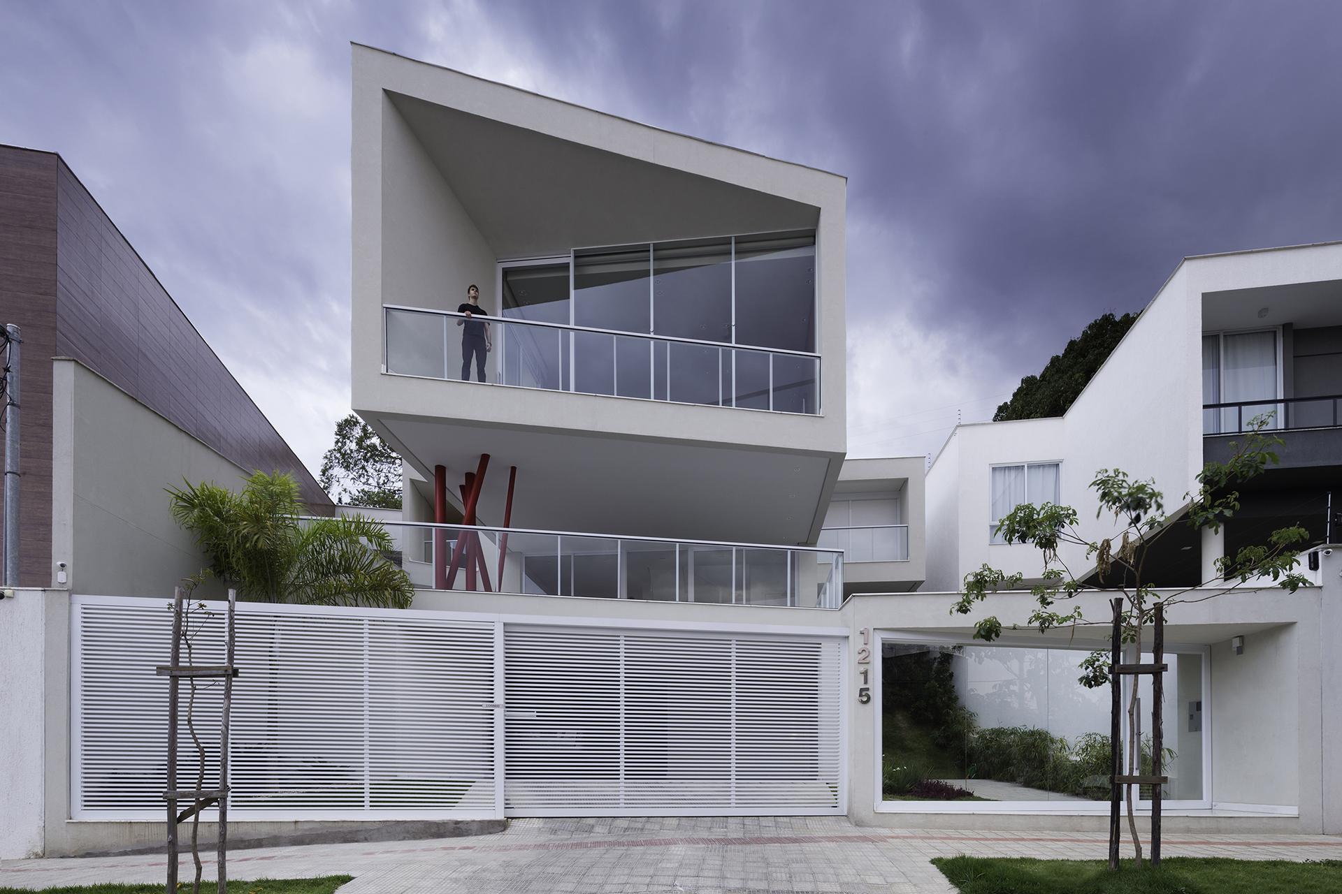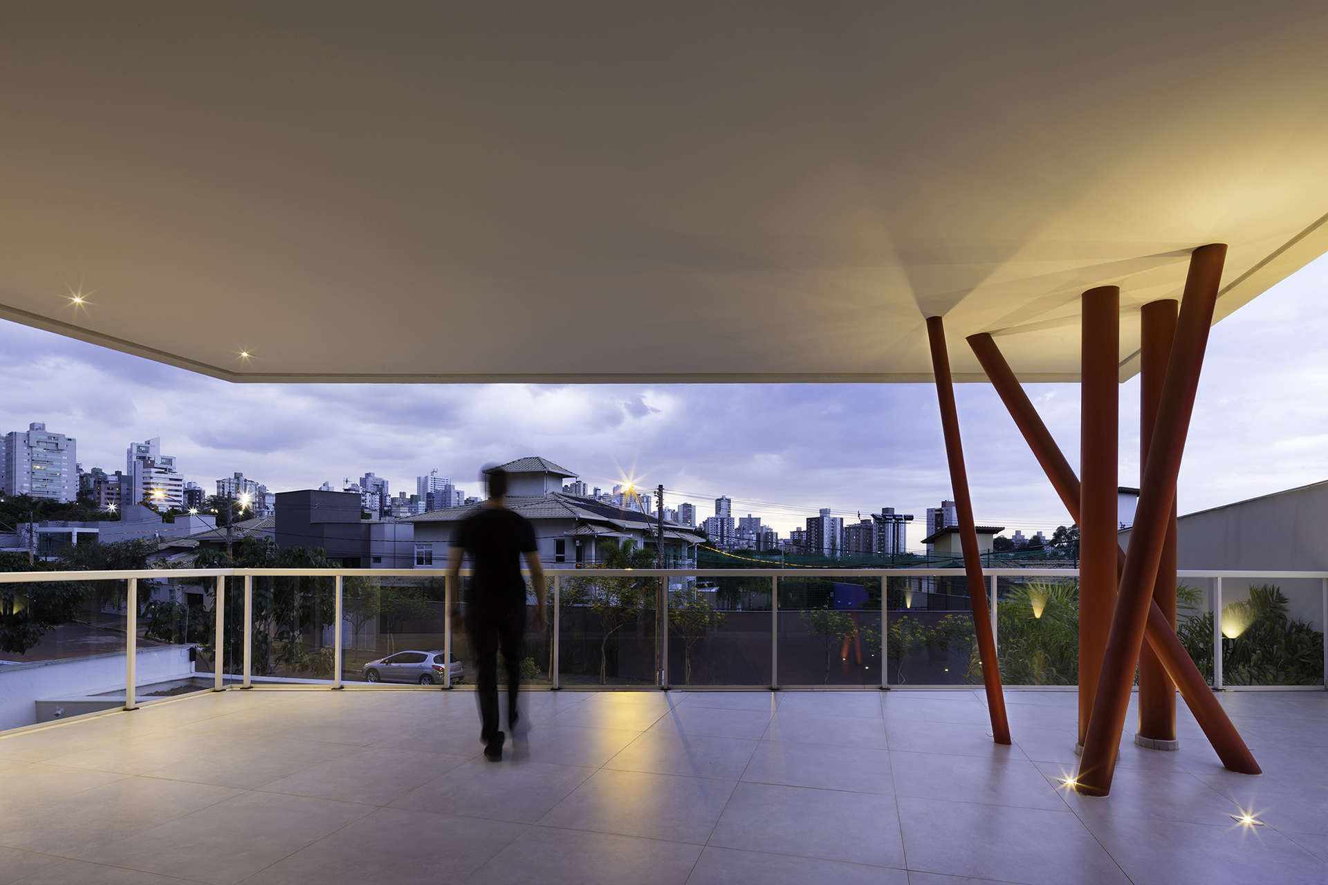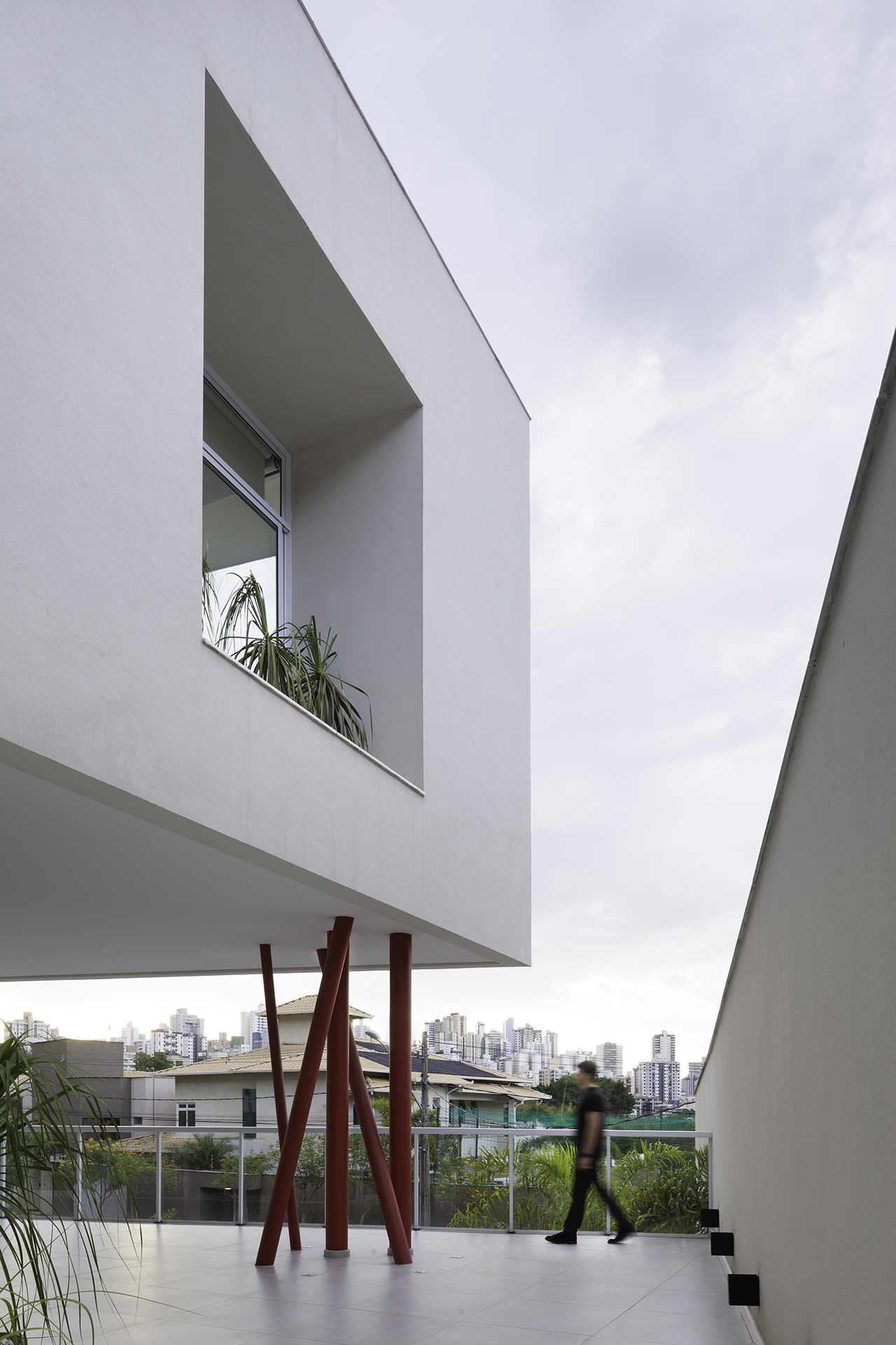 Os pilares que apoiam o terceiro nível vem como o elemento indagador deste projeto. Em cor vibrante e formato excêntrico, impele-se como um ícone de destaque na composição total. Joga consigo mesmo em um constante estado de movimento, congelado em algum momento na estaticidade do concreto. Questiona a frieza e solidez das cores austeras do todo, provoca a palidez do branco e traz os olhos para o que, por sua vez, poderia ser convencional.