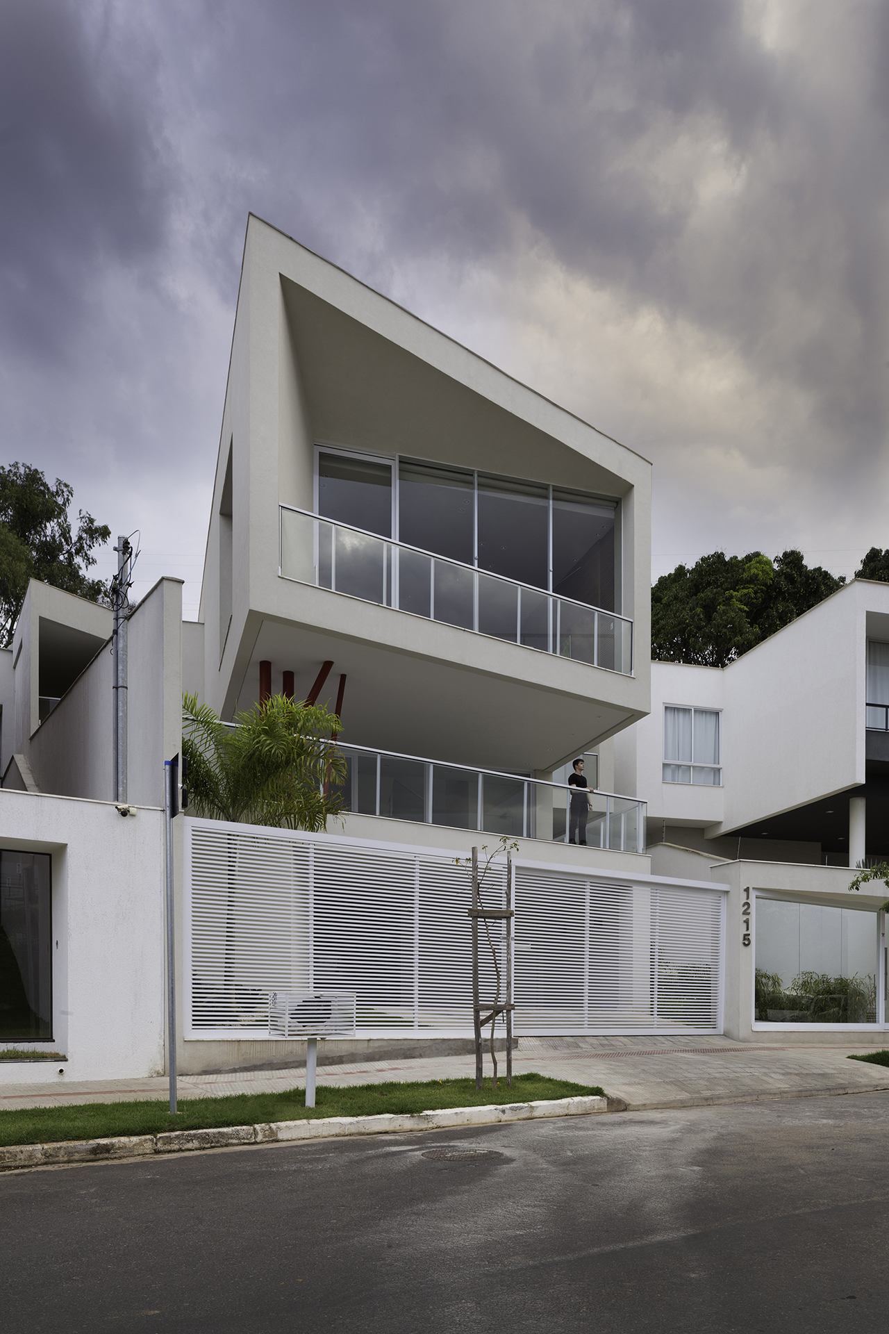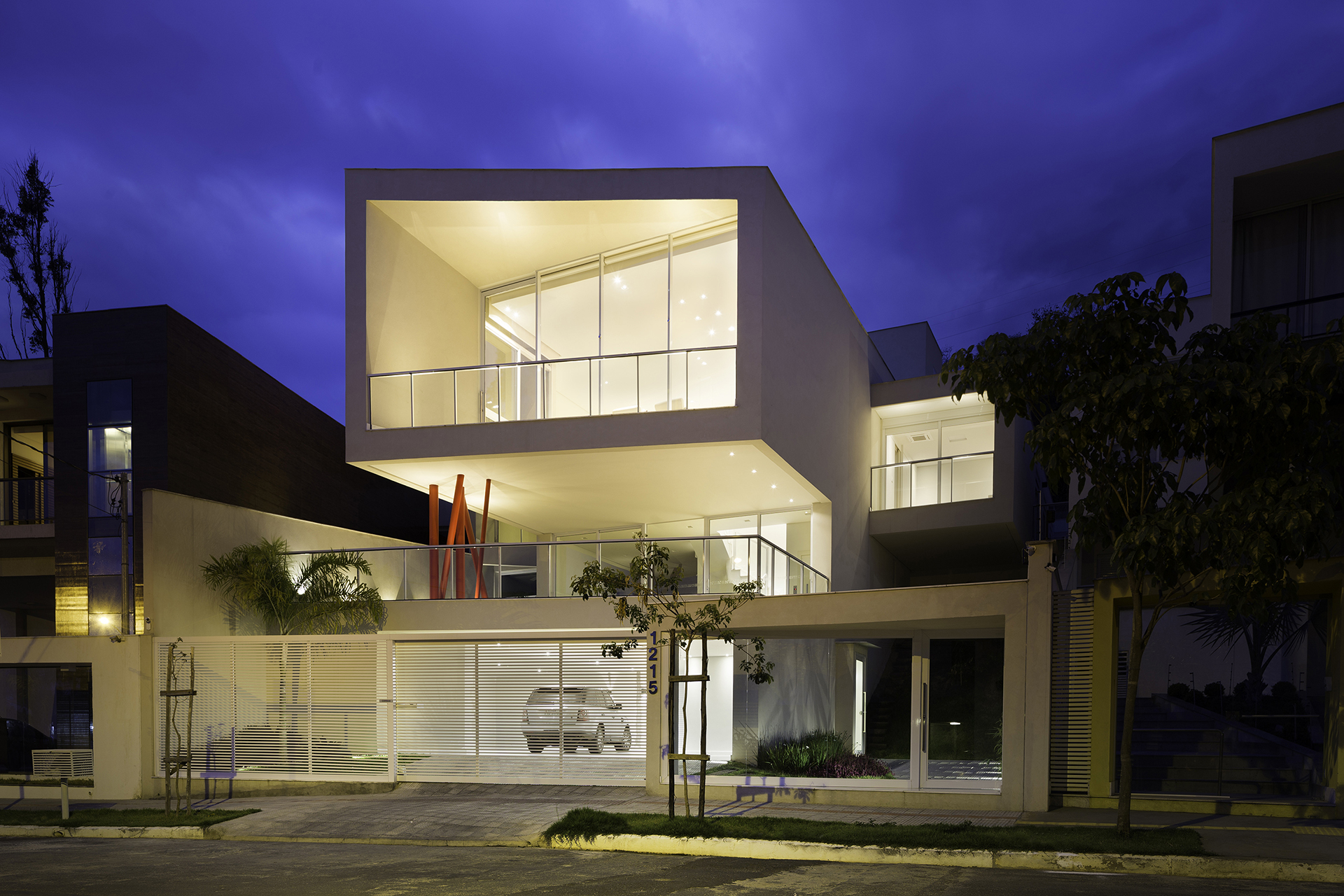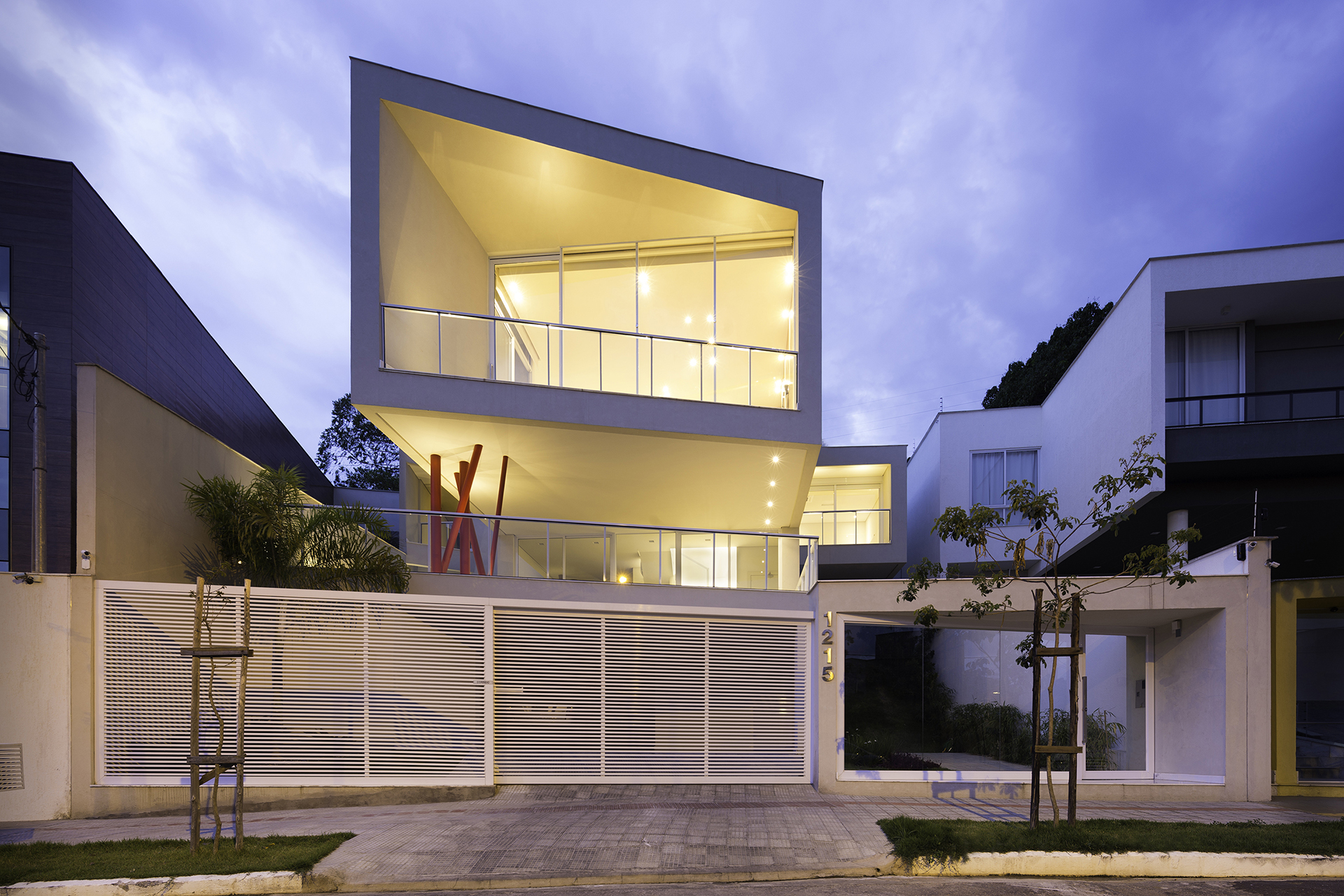 Os pilares que apoiam o terceiro nível vem como o elemento indagador deste projeto. Em cor vibrante e formato excêntrico, impele-se como um ícone de destaque na composição total. Joga consigo mesmo em um constante estado de movimento, congelado em algum momento na estaticidade do concreto. Questiona a frieza e solidez das cores austeras do todo, provoca a palidez do branco e traz os olhos para o que, por sua vez, poderia ser convencional.