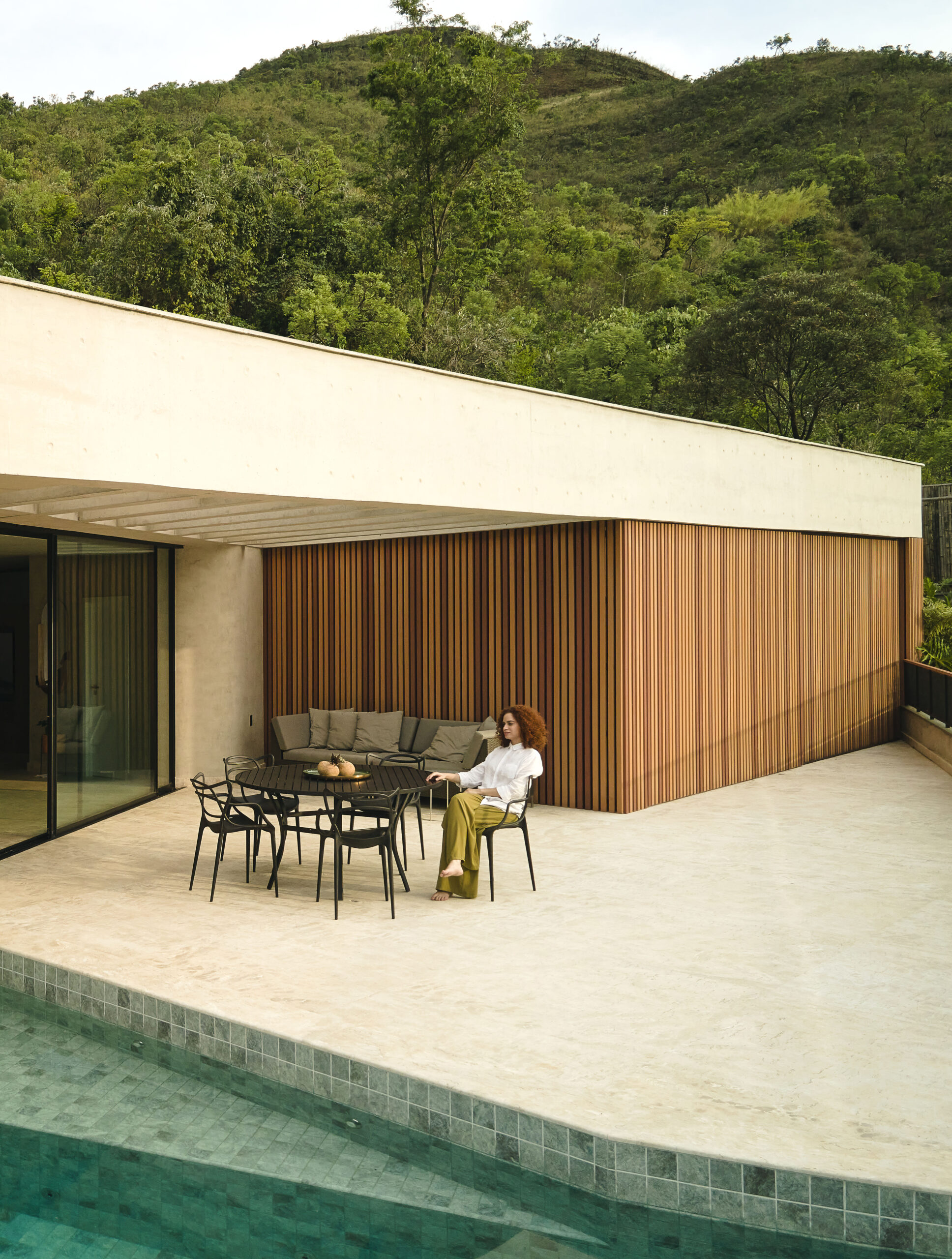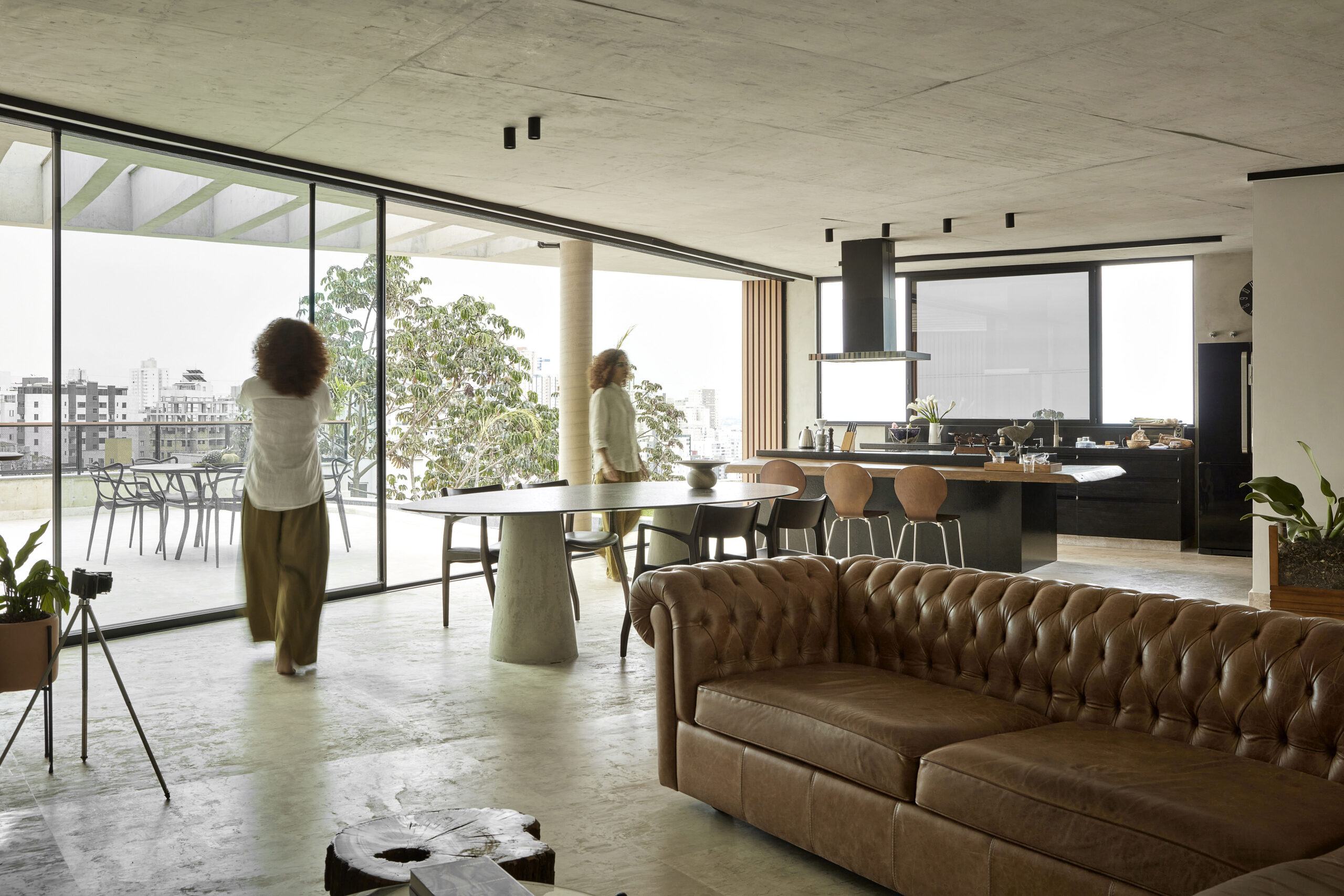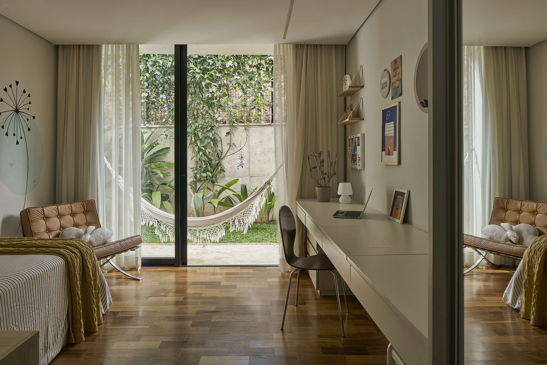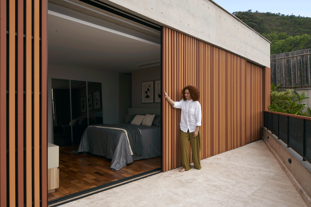 Esse diálogo simultâneo com o urbano e a natureza constrói uma atmosfera dualista, em que a paisagem é protagonista. Sob esse olhar, é possível tanto aproveitar a tranquilidade do quarto abraçado pelo verde ao som do vento sobre as folhas, como também abrir-se à rua pela varanda, vislumbrando no horizonte as luzes da cidade.