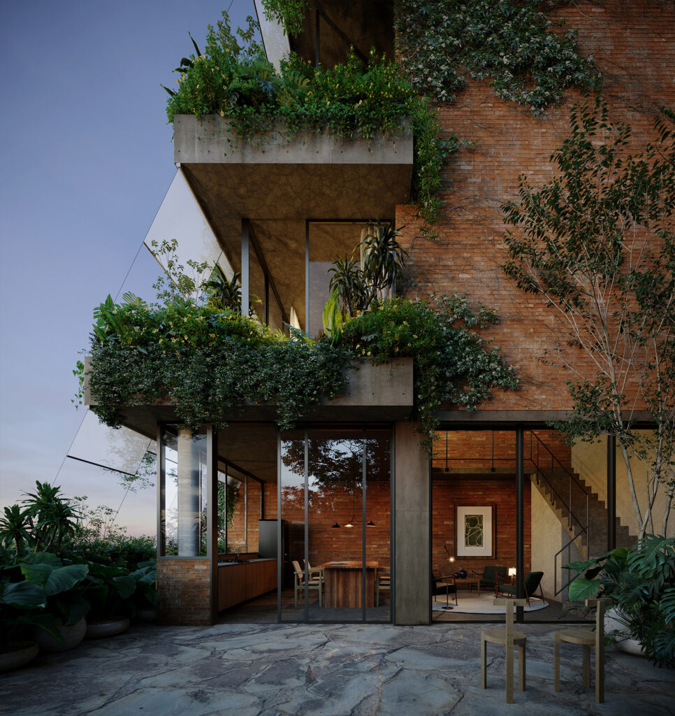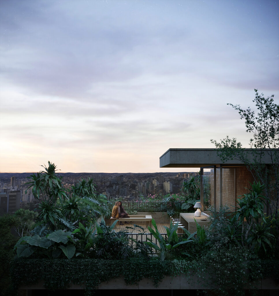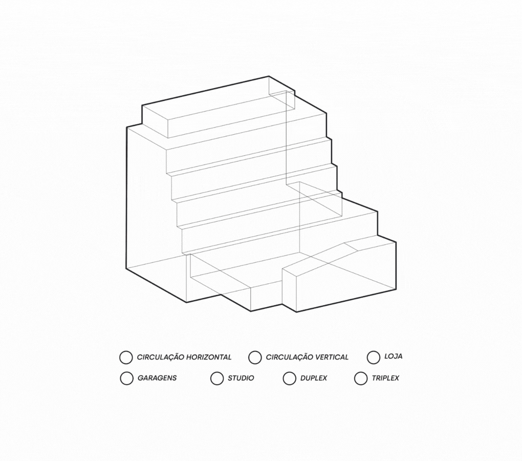 Para isso, foi concebido um grande módulo de lofts de um, dois e três pavimentos, todos providos de terraços privativos, vista definitiva e materialidade natural e atemporal, produzindo espaços abertos, versáteis, aconchegantes, intimistas e acolhedores, além de visualmente impressionantes. No térreo, há também uma ampla unidade comercial, que traz ainda mais vida e pluralidade ao edifício.